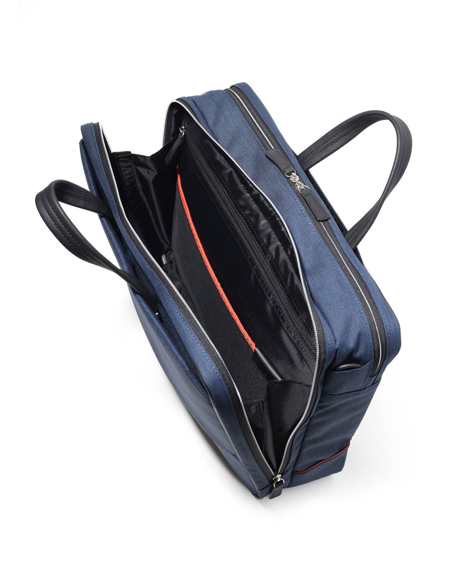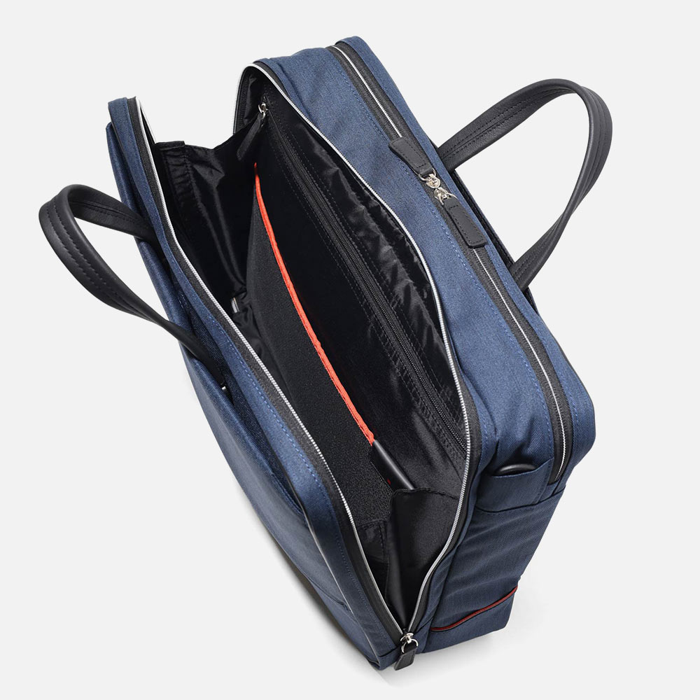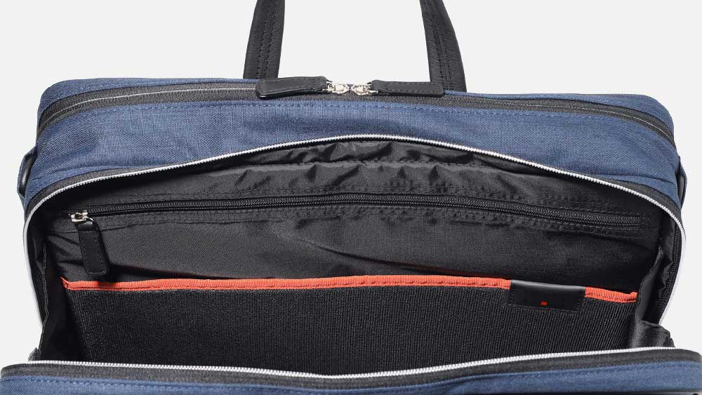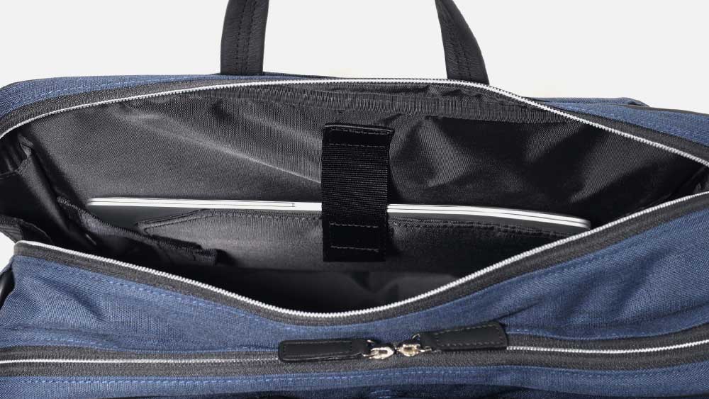 豊富な収納ポケットで、ビジネスに必要なあらゆる荷物の持ち運びが可能です。B4ファイルがすっぽり収まるメインコンパートメントは前室と後室に分かれた2層タイプ。1泊2日の出張にも対応した大容量なビジネスバッグです。前室にはファスナーポケットが1つ、大中小のポケットが1つずつ装備されています。ガジェット類など細かな荷物を整理して収納が可能です。後室には15.6インチPC収納ポケットがあり、出張先にもPCを持ち運ぶことができます。また、ビジネスバッグの前面にはアオリポケットがあり、新聞やサッと取り出したい小物の収納に便利です。フロントのファスナーポケットは浅型に設計しており、さらに内側はパイル生地を使用することで、スマートフォン等を入れても画面を傷つける心配がありません。