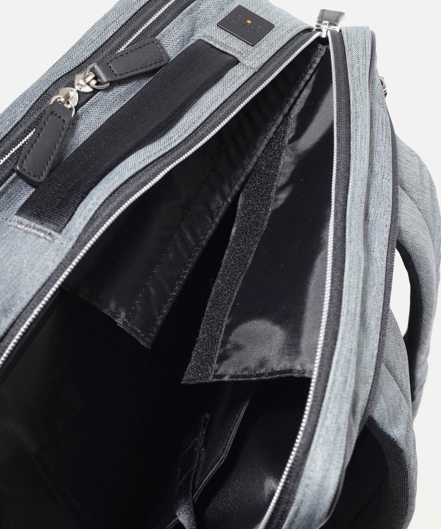 カバンの背側ファスナー内には、リュック紐が収納されています。バックルに装着してリュックスタイルとしても活躍します。マチ部分はマジックテープで開閉できるため、リュックとしてカバンを縦型に使うときもカバンの上部から荷物を出し入れすることができます。