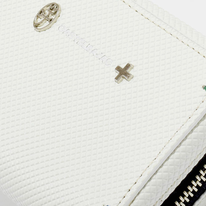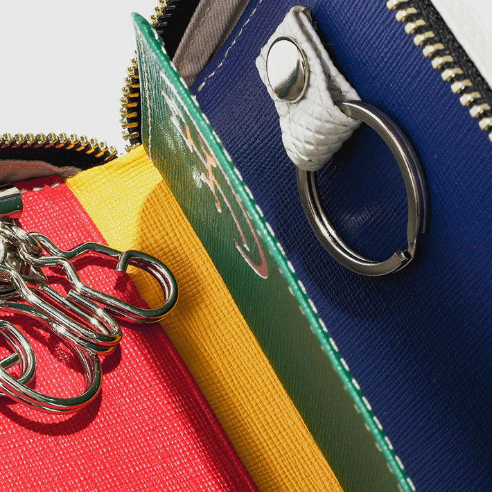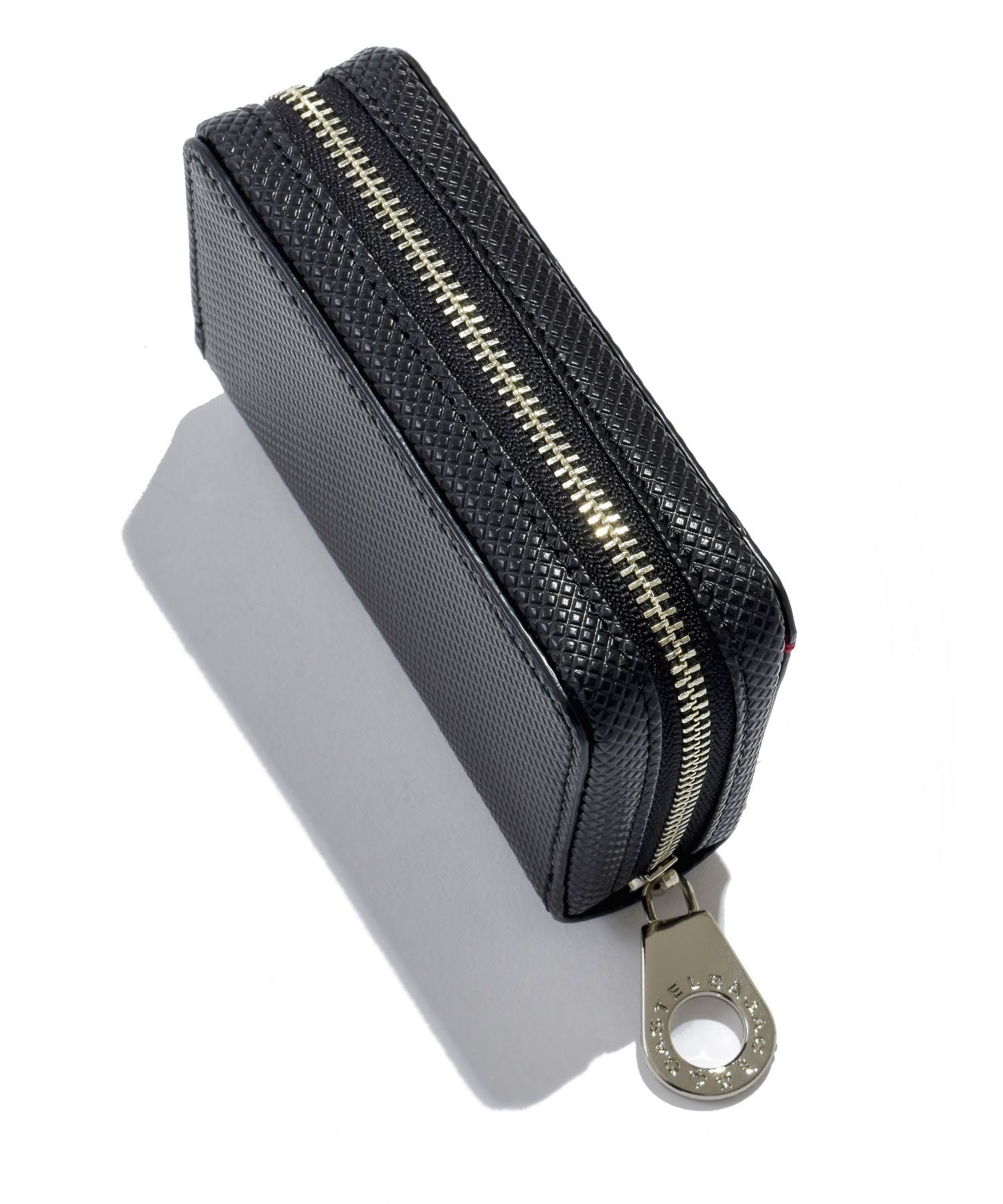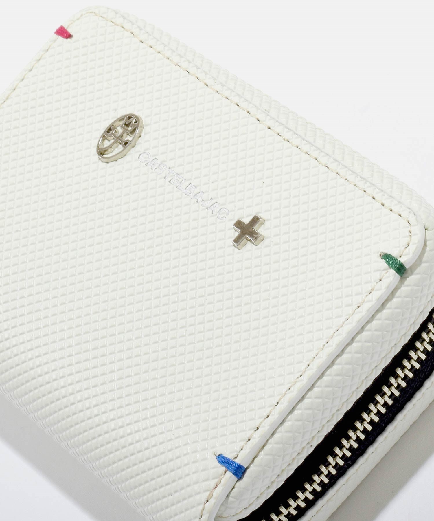 格子柄のエンボス加工を施した牛革を斜めに使用することでダイヤ柄を表現したカステルバジャックらしいPOPな雰囲気のスマートッキー対応のキーケース。ツヤ感とダイヤ柄による濃淡で独特の奥行き感と立体感をだしています。四角に施されたカステルバジャックカラーのステッチもデザインポイントです。