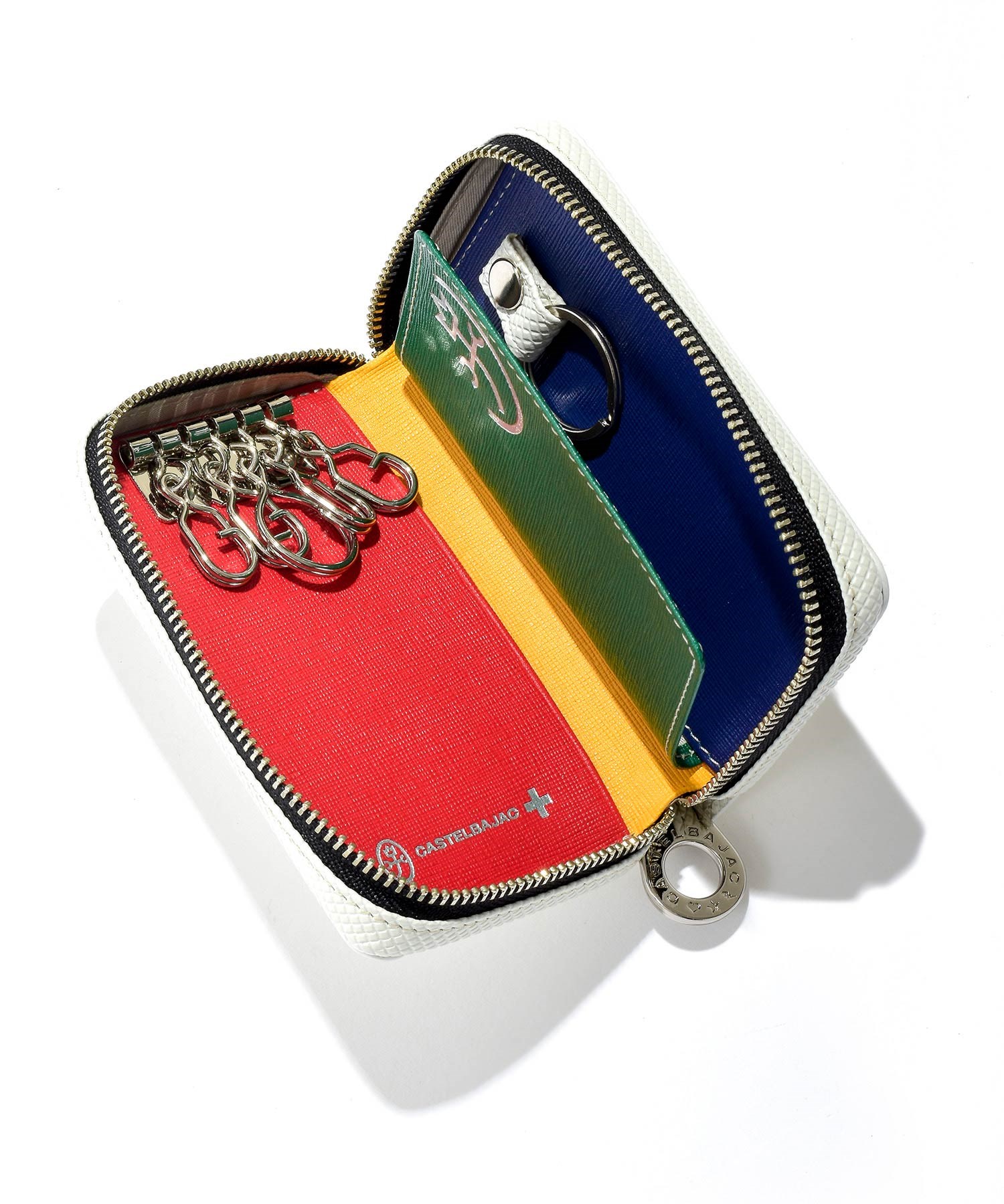 内装には細かいエンボス加工を施した牛革を使用し、カステルバジャックカラーである4色をインパクトのあるブロック状のコンビネーションで使用しています。