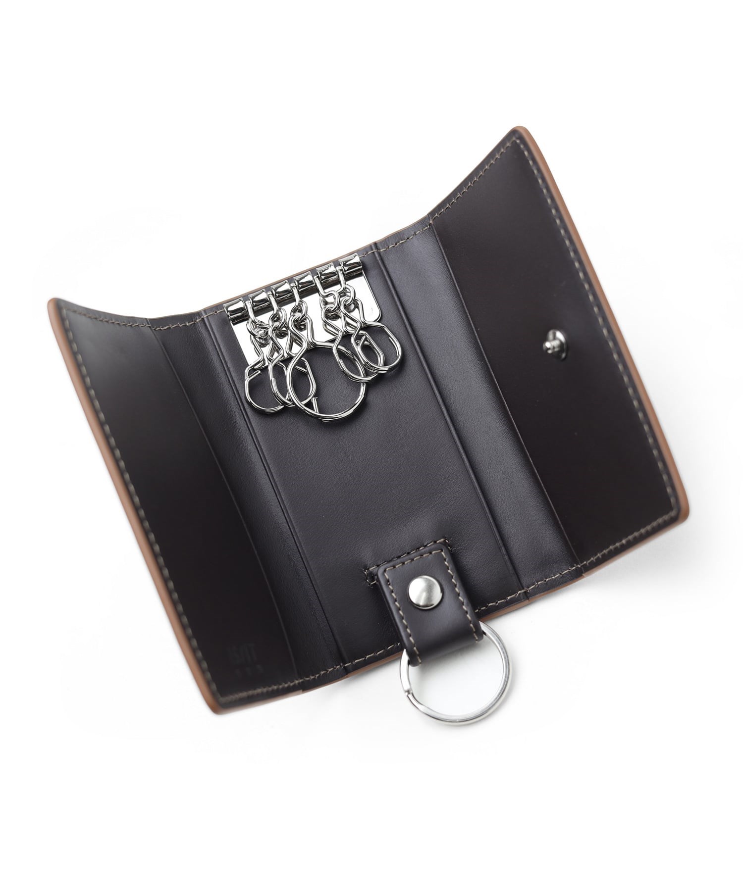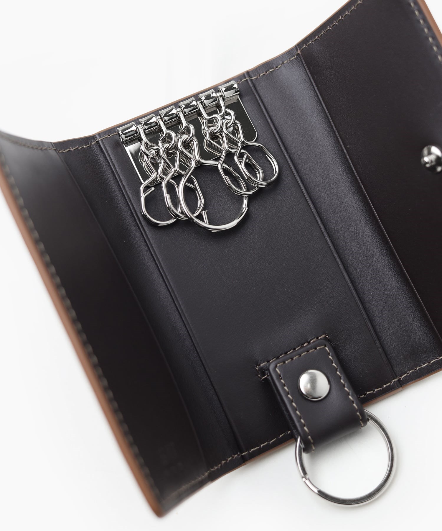 ホックタイプのキーケース。小さなポケットが3つ、キーリングは大1つ、小4つ付いています。ダブルリングは、ホックで取り外しが可能です。